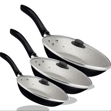 Jogo de frigideira Tramontina 3 peças com tampa.